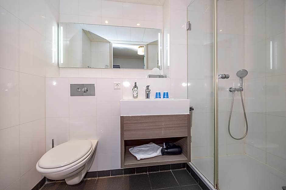 Modern comfortable room with climate control, a flat-screen TV and a bathroom with rain shower.